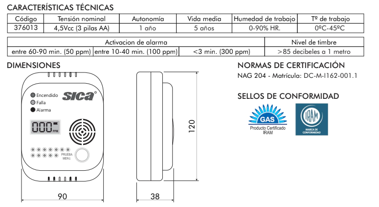 Este dispositivo esta diseñado para detectar, mediante un sensor electroquímico, y alertar mediante una alerta sonora, la presencia de bajos niveles de monóxido de carbono en lo ambientes. Posee tres LEDS que indican el estado de funcionamiento. Ademas cuenta con un
